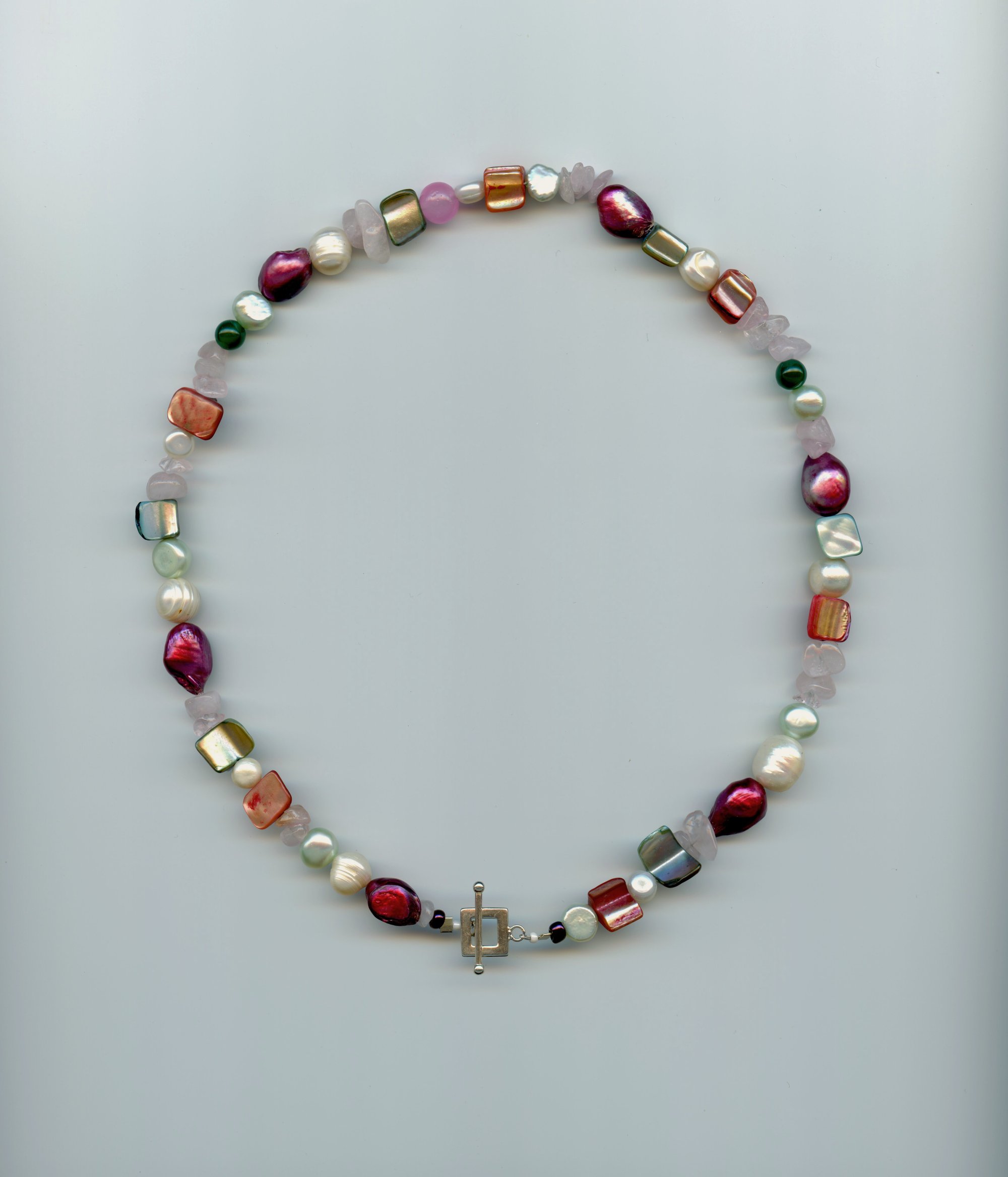 Baroque pearl, rose quartz, mother of pearl, agate